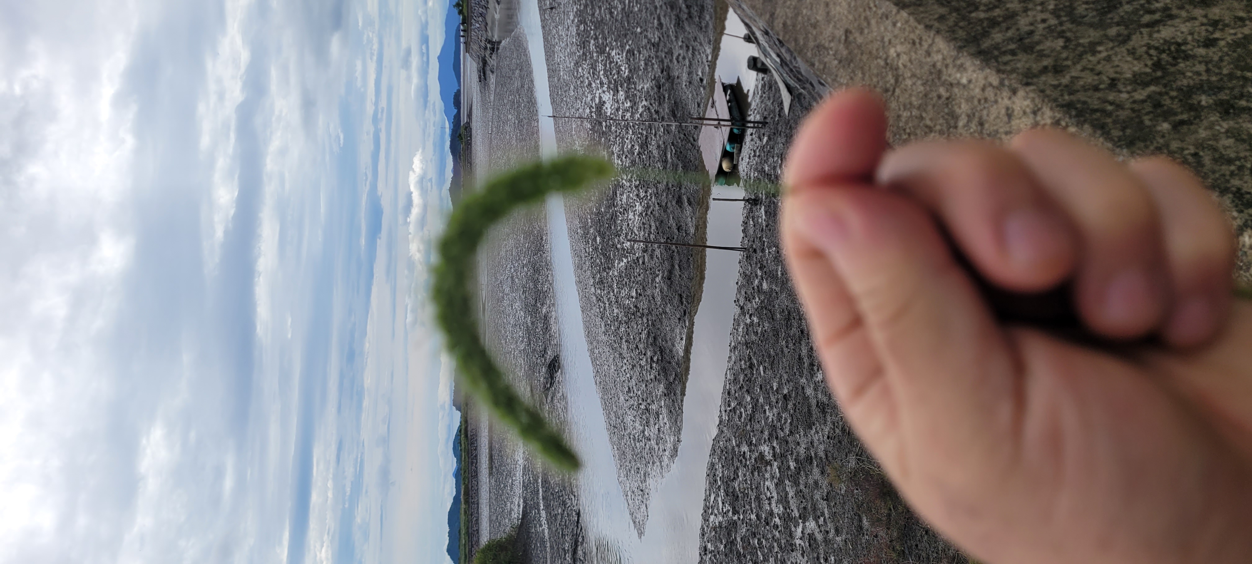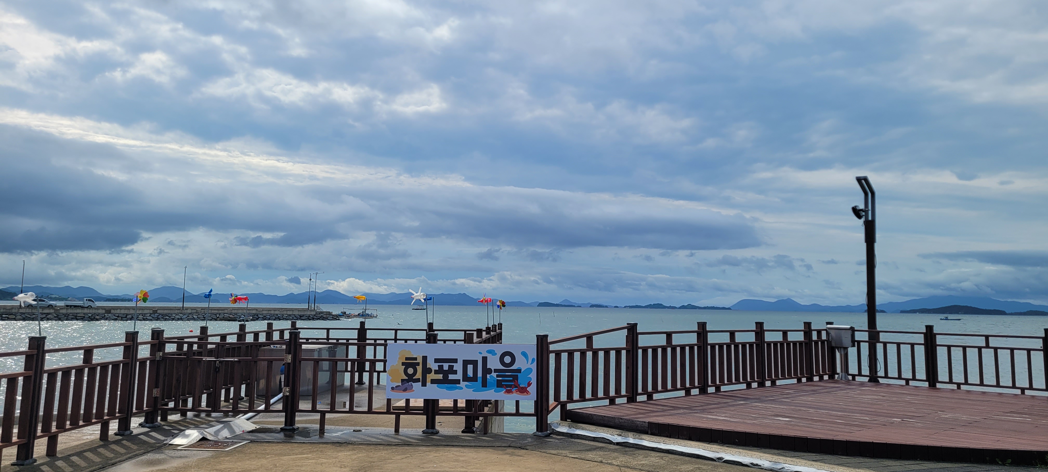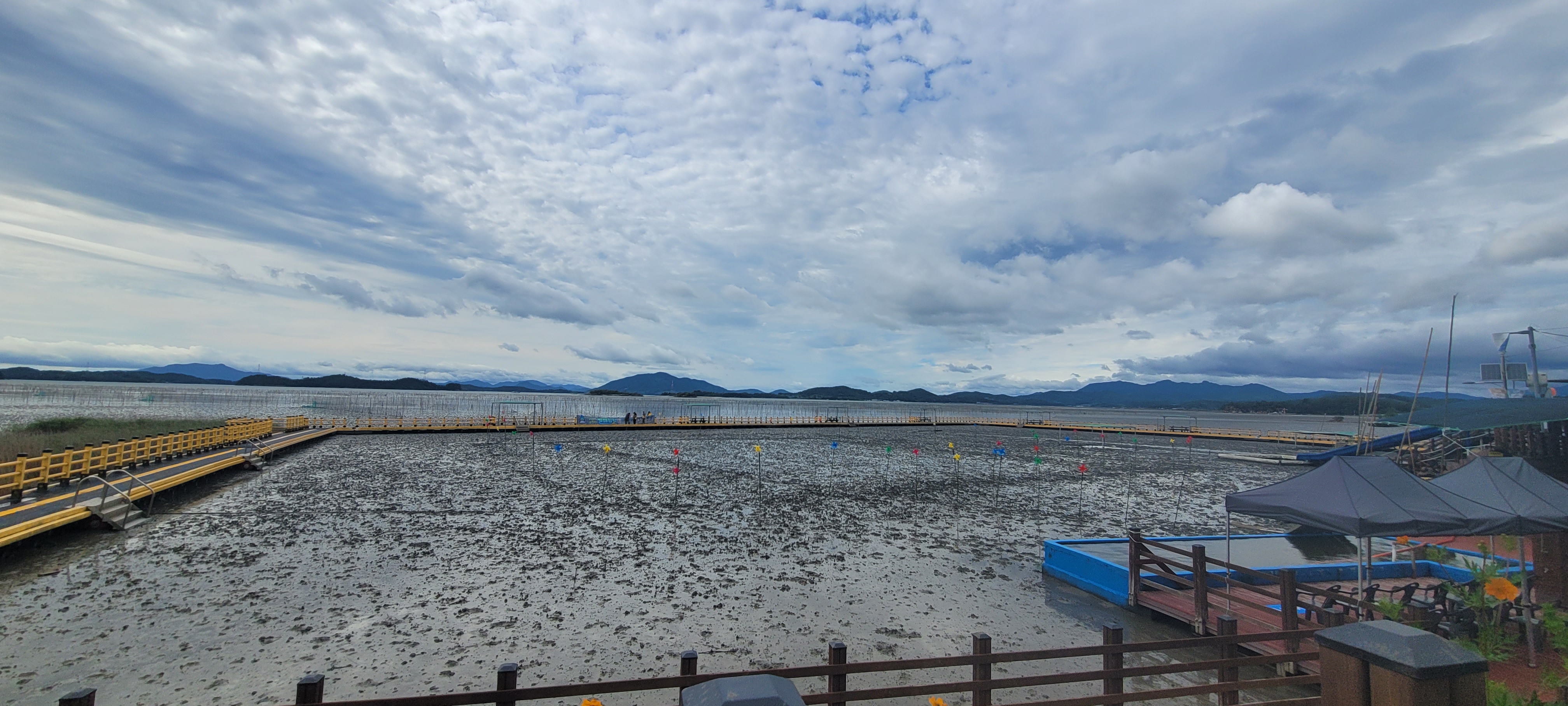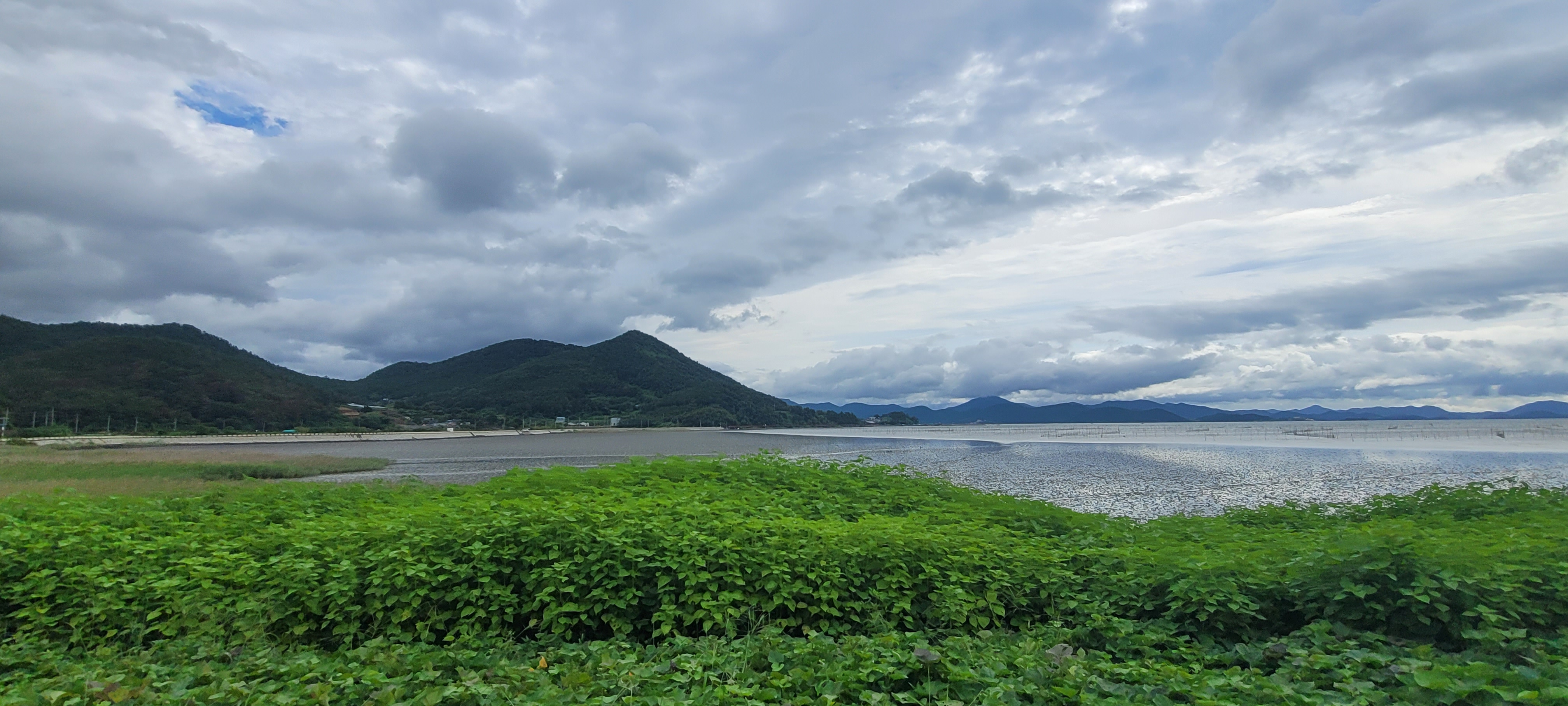 앞으로는 초록빛 덩굴이 넓게 펼쳐져 있고, 그 너머로 잔잔한 갯벌과 바다가 이어집니다. 멀리 산과 구름이 겹겹이 쌓여 한 폭의 수묵화를 보는 듯했습니다. 흐린 하늘 사이로 파란 틈새가 열리며, 풍경은 오히려 더 깊고 차분하게 다가왔습니다.
