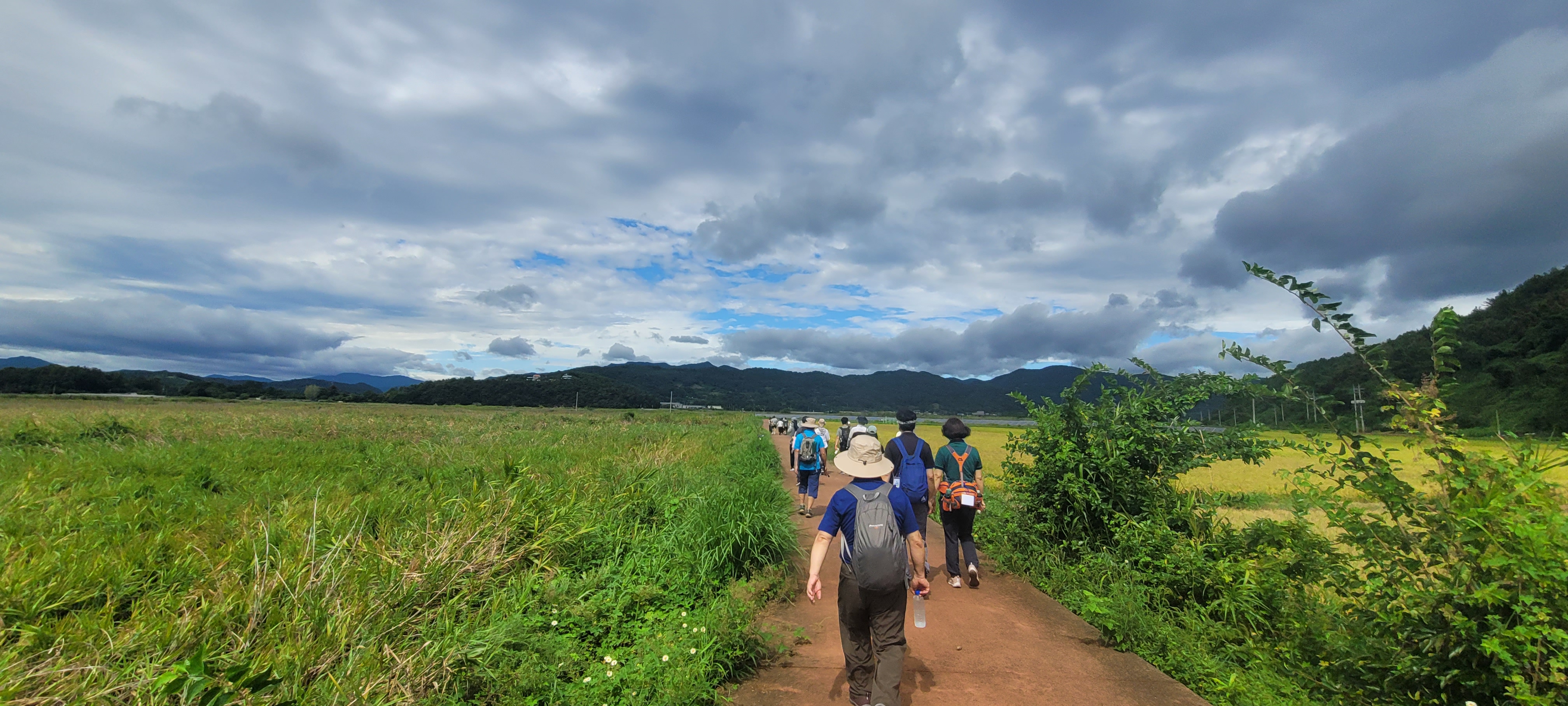 걷는 길의 한쪽에는 끝없이 펼쳐진 바다와 갯벌이, 다른 한쪽에는 벼들이 누렇게 익어가는 황금벌판이 나란히 자리하고 있었습니다. 그 위로 드넓은 푸른 가을 하늘까지 더해지니, 풍경은 마치 한 폭의 그림 같았습니다.