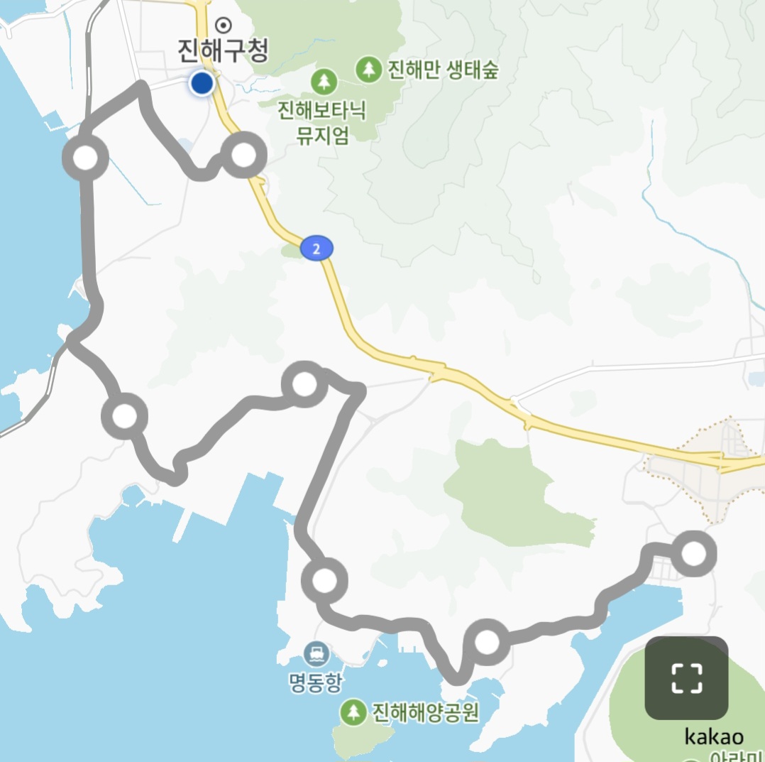 제덕사거리 → 진해해양공원 → 행암동 → 장천동 → 상리마을