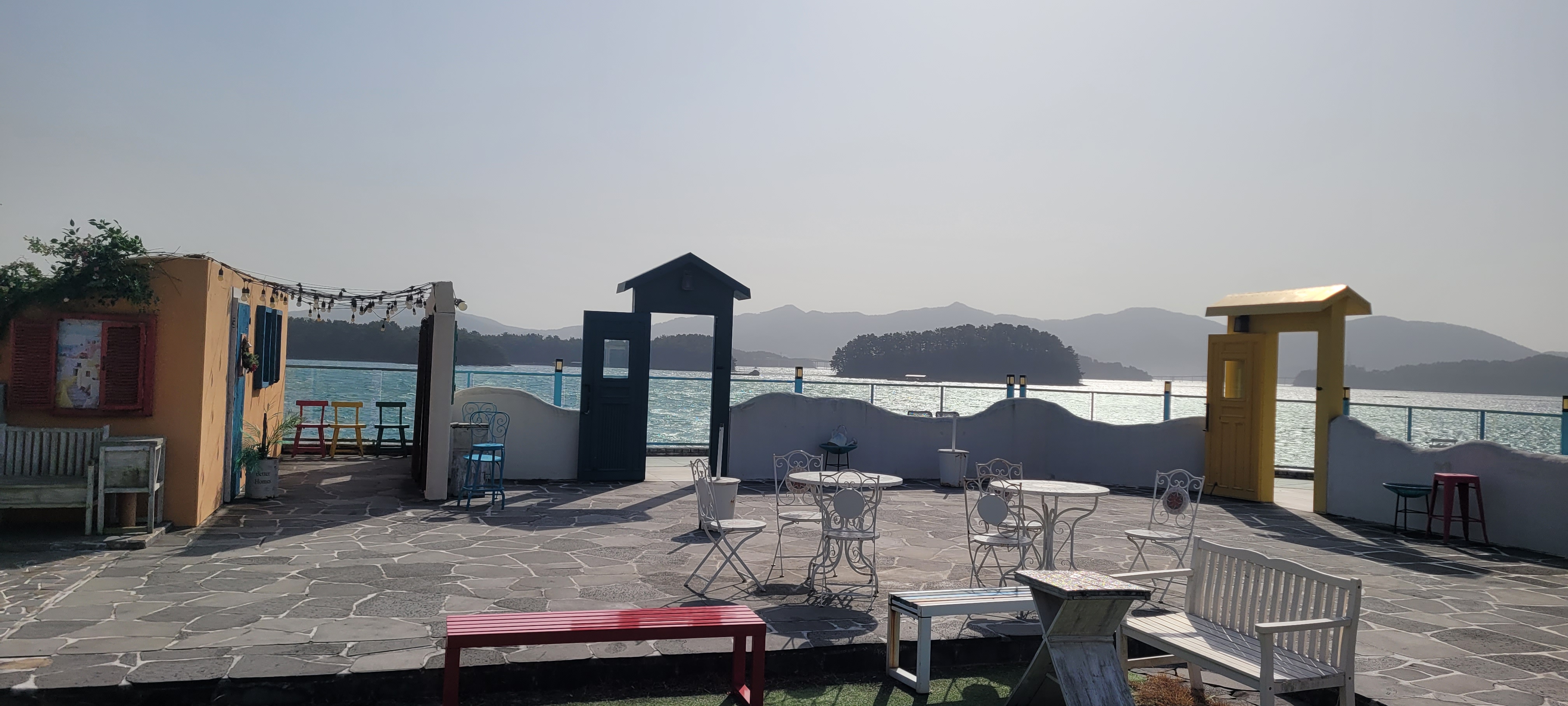 바다 앞, 그리스풍의 하얀 벽과 푸른 색감이 어우러진 카페 도어스에 앉았다. 통영 바다가 바로 앞에 펼쳐진 자리.